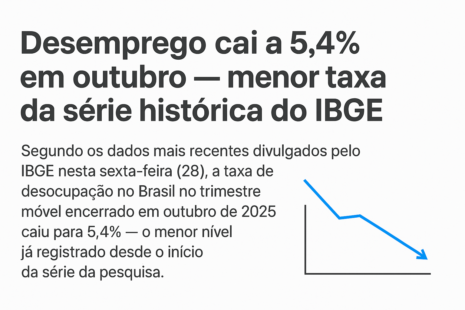 Segundo os dados mais recentes divulgados pelo IBGE nesta sexta-feira (28), a taxa de desocupação no Brasil no trimestre móvel encerrado em outubro de 2025 caiu para 5,4% – o menor nível já regi...