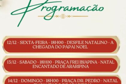 A programação natalina de Araripina segue ganhando forma com o projeto promovido pela Prefeitura de Araripina por meio da Secretaria de Turismo e Juventude e da Secretaria de Educação. O cronograma, d...