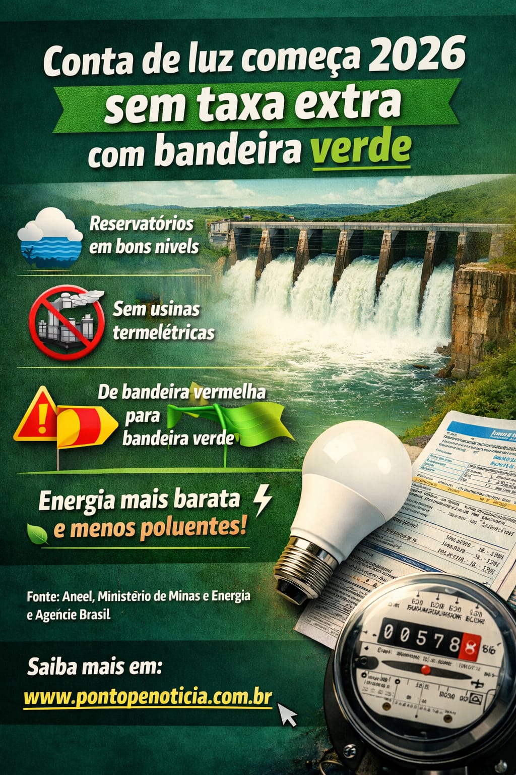 A Agência Nacional de Energia Elétrica (Aneel) confirmou nesta terça-feira (23) que o mês de janeiro de 2026 será marcado pela aplicação da bandeira tarifária verde em todo o país. Na prática, isso significa que os consumidores não terão cobrança adicional na conta de energia elétrica.