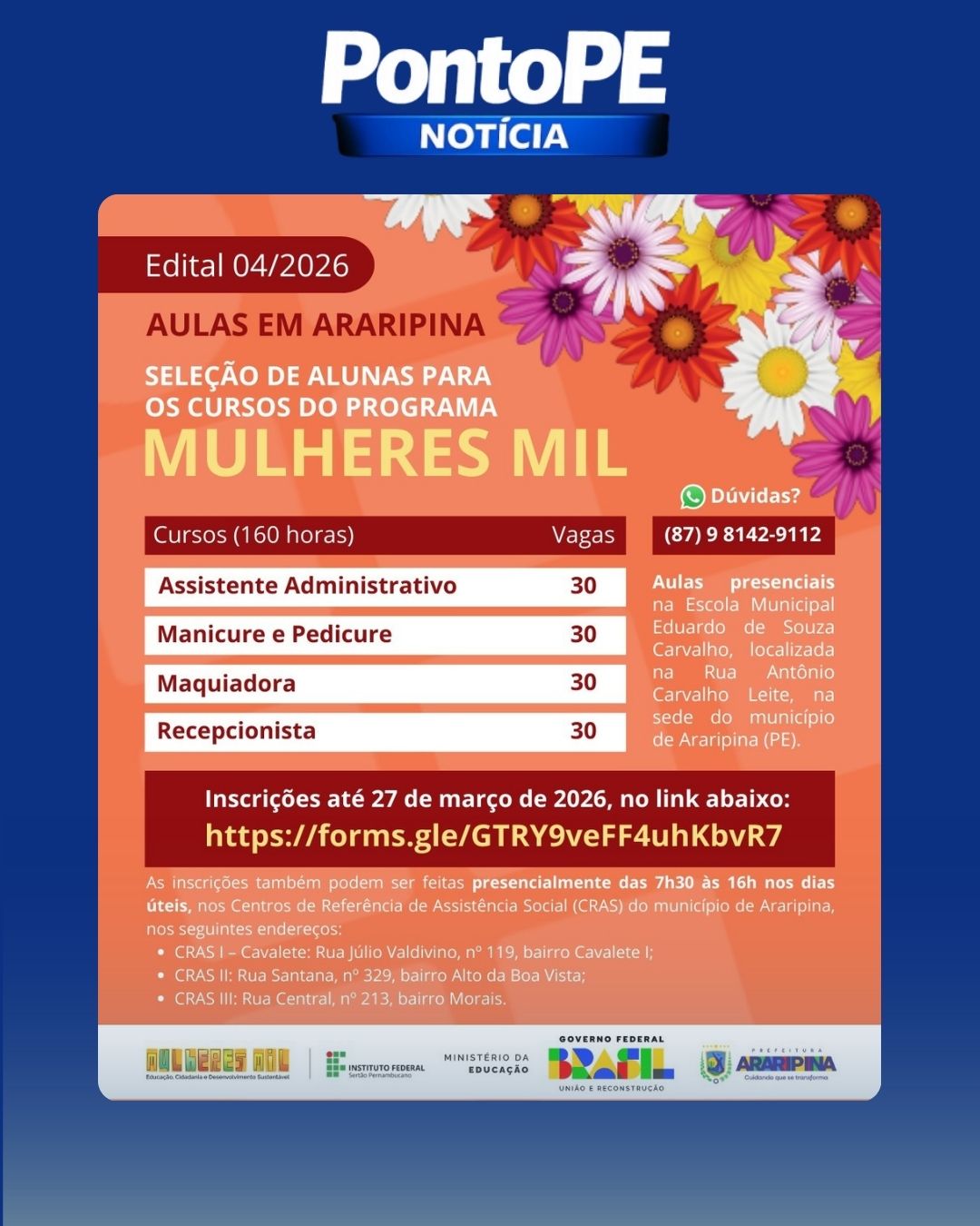 Estão abertas, em Araripina, as inscrições para cursos gratuitos do Programa Mulheres Mil, conforme o Edital 04/2026. A iniciativa oferece qualificação profissional voltada ao público feminino, com o objetivo de promover inclusão social e geração de renda.