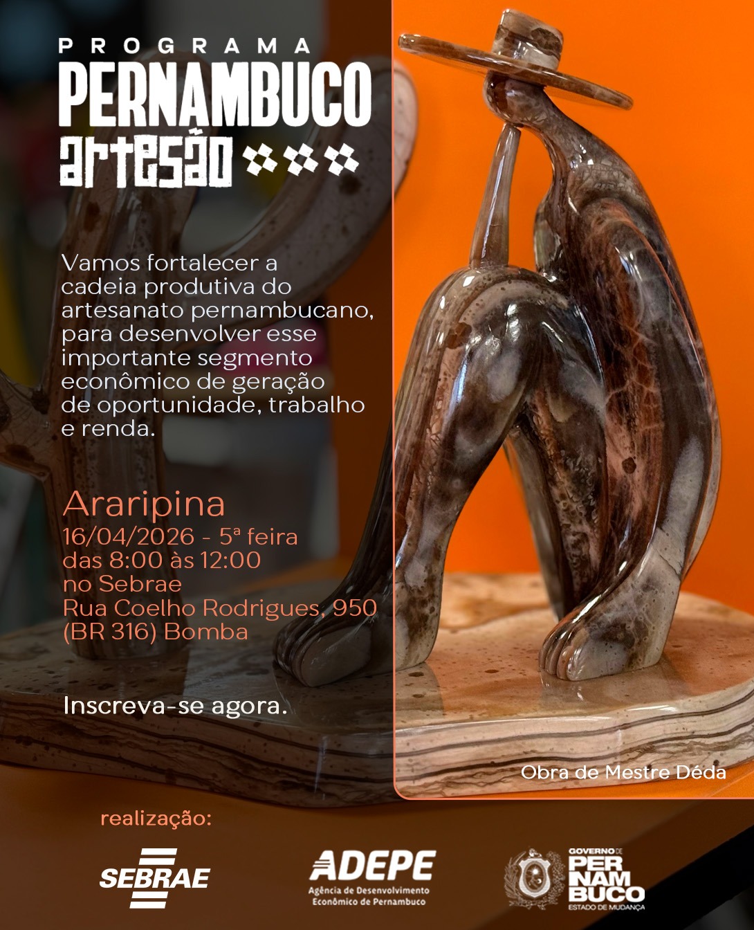 O Governo de Pernambuco, em parceria com o SEBRAE Pernambuco, realiza no dia 16 de abril, em Araripina, o lançamento do Programa Pernambuco Artesão 2026.