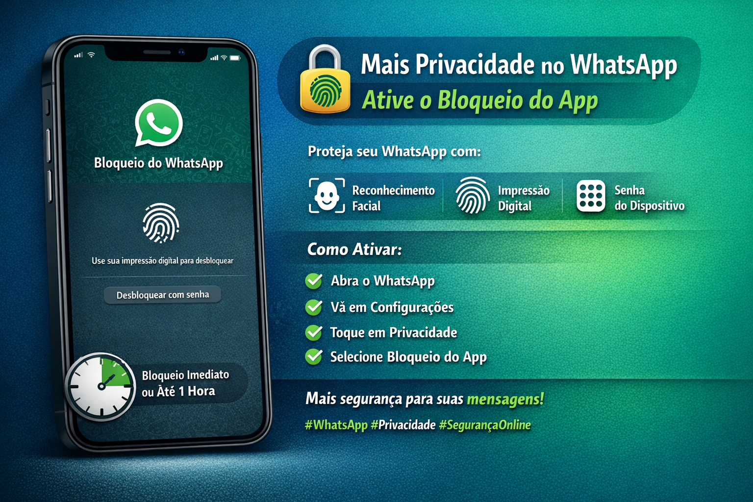 Com o Bloqueio do app ativado, o acesso ao WhatsApp passa a exigir reconhecimento facial, impressão digital ou a senha do próprio aparelho, garantindo maior proteção às mensagens e aos dados pessoais do usuário. O sistema permite, ainda, definir o tempo para o bloqueio automático, que pode ocorrer de forma imediata ou após um intervalo de até uma hora sem uso.